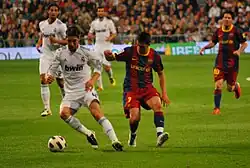 Villa started the season with goals against Mexican clubs Guadalajara and América in pre-season friendly matches.[103][104] His first official match of the season was against Real Madrid in the first leg of the 2011 Supercopa de España, where Villa scored a "world-class" goal to help Barça seal a 2–2 draw at the Santiago Bernabéu,[105] while on 17 August 2011, Villa was sent off in the dying moments of the second leg (which Barcelona won 3–2) after an altercation with Mesut Özil.[106] Against Osasuna on 17 September 2011, Villa contributed two goals and forced Rovérsio into scoring an own goal in Barcelona's 8–0 win over the team from Pamplona.[107] He then broke his tibia in a Club World Cup match in Yokohama against Al Sadd. Doctors said he was to be out of action for up to six months,[108][109][110] but this eventually led to him missing the entire 2011–12 season with both Barcelona and the Spanish football team at Euro 2012.