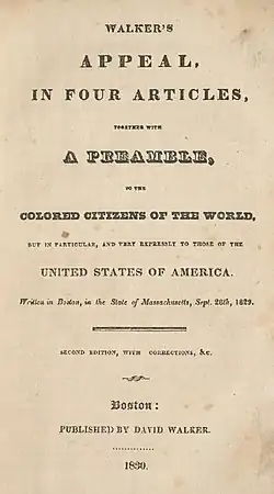 - ^ a b Walker, David (1830). "Walker's Appeal, in Four Articles; Together with a Preamble, to the Colored Citizens of the World, but in Particular, and Very Expressly, to Those of the United States of America, Written in Boston, State of Massachusetts, September 28, 1829". Boston: David Walker. Archived from the original on July 2, 2018. Retrieved November 20, 2018.
