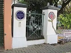With the permission of the current owners the house has been decorated with designs made from tiles under the artistic guidance of Ilse Pahl, but the work has been done by a community of his friends. The design includes an outline of his daughter's hand, outstretched hands of friendship, local cattle and a football stadium.[2] The message reads: