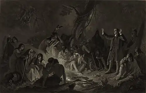 In 1739, Zeisberger was influential in the development of a Moravian community in Bethlehem, Pennsylvania, and was there at its dedication on Christmas Eve 1741. Four years later, at the invitation of Hendrick Theyanoguin, he came to live among the Mohawk. He became fluent in the Onondaga language and assisted Conrad Weiser in negotiating an alliance between the Thirteen Colonies and the Iroquois in Onondaga (near present-day Syracuse, New York). Zeisberger also produced dictionaries and religious works in Iroquoian and Algonquian,[3] making him the father of Lenape writing [4]