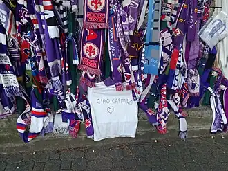 Later that month, Fiorentina announced that they would rename their training ground "Centro Sportivo Davide Astori" after Astori.[158] Also later that month, in Italy's friendly with Argentina on 23 March, as well as Italy's friendly against England on 27 March, the Italy squad shirts were embossed with, under the crest, "Davide sempre con noi", Italian for "Davide always with us", with the number 13 below.[159][160] Although Serie A introduced a new ruling ahead of the 2018–19 Serie A season, which introduced a standardised armband for all club captains, Fiorentina's new captain, Germán Pezzella, was granted an exemption by the league, and was allowed to wear a personalised captain's armband in tribute to Astori.[161] Later that year, Astori was inducted into the Fiorentina Hall of Fame.[162]