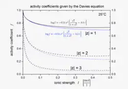 The Davies equation is an empirical extension of Debye–Hückel theory which can be used to calculate activity coefficients of electrolyte solutions at relatively high concentrations at 25 °C. The equation, originally published in 1938,[1] was refined by fitting to experimental data. The final form of the equation gives the mean molal activity coefficient f± of an electrolyte that dissociates into ions having charges z1 and z2 as a function of ionic strength I: