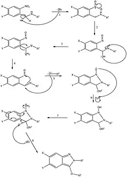 The current proposed mechanism for the Davis–Beirut reaction in base was first published in 2005 by Kurth, Olmstead, and Haddadin. The reaction occurs when a N-substituted 2-nitrobenzylamine is heated in the presence of base, such as NaOH and KOH, and an alcohol and includes the formation of a carbanion[3] The reaction begins with the base removing a hydrogen (1) adjacent to the secondary amine-group, creating a carbanion. The carbanion then extracts an oxygen from the nitro group (2), which is then subsequently protonated, most likely by water. The newly formed hydroxyl group (3), then extracts the secondary amines hydrogen, leaving a negative charge on nitrogen and creating a protonated hydroxyl group. The oxygen and its hydrogens then leave as a molecule of water (4), creating a double bond with the previously negatively charged nitrogen atom. The new pi bond makes the carbon adjacent to the nitrogen more susceptible for attack by a present alcohol (5), which in turn creates an oxygen-carbon bond, a bond between the two nitrogen atoms, and pushes electrons onto the oxygen molecule originally from the amide. This molecule is then protonated (6) to create an overall net neutral charge. The hydroxyl group is protonated similarly to step three (7), creating a good leaving group. Therefore, when the alpha hydrogen of the nitrogen atom and ether group (8) is extracted by the base, the flow of electrons creates two new carbon-nitrogen bonds and causes the loss of the protonated hydroxyl group as a molecule of water. The final product produced by this mechanism is therefore a 3-oxy-substituted 2H-indazole.