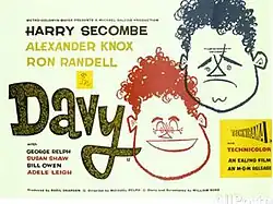 Davy is a 1958 British comedy-drama film directed by Michael Relph and starring Harry Secombe, Alexander Knox and Ron Randell.[2][3] It was written by WIlliam Rose. It was the last comedy to be made by Ealing Studios and was the first British film in Technirama.[4] Davy was intended to launch the solo career of Harry Secombe, who was already a popular British radio personality on The Goon Show, but it was only moderately successful.[5]