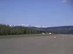 Dawson City Airport (IATA: YDA, ICAO: CYDA) is located 8 nautical miles (15 km; 9.2 mi) east of Dawson City, Yukon, Canada, in the Klondike River valley, and is operated by the Yukon government. It has a terminal building and a runway which was paved in May 2019.[4] The asphalt runway is 5,003 ft × 100 ft (1,525 m × 30 m) long and at an elevation of 1,215 ft (370 m). A number of studies have recommended moving the airport or realigning the runway as it is in a narrow mountain valley.
