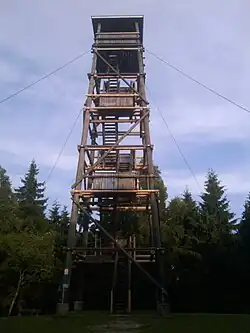 The Naturpark Soonwald-Nahe reaches from the heights of the Hunsrück over the quartzite combs of the Soonwald with its dales deeply carved by brooks to the vineyard slopes in the sunny and dry valley of the Nahe. The landscape and climate combine to give the park a great floral and faunal diversity. Found in the Soonwald-Nahe Nature Park are such varying habitats as blossom-filled woodland glades, mires, slate mine galleries, juniper heaths, meadow orchard areas, and brooks, riverside flats, dry grasslands and fallow vineyards with luxuriant orchid growth. The Salzkopf is the greatest elevation in the Bingen Forest (628 m). As early as 1899 the first wooden tower, mainly for military purposes, was built there by the Mainzer Pionierbataillon. In 1973, this tower was succeeded by a 24 m-tall one, the Salzkopfturm, which had to be renovated in 1997 owing to damage from carpenter ants. It is constructed of waterproofed sprucewood, while the steps are made of oak from the forest itself. It stands just north of Daxweiler. On a clear day, one can enjoy an outstanding view of up to 140 km. Living in the nature park is a broad palette of native animals. Among mammals are the red deer and the wild boar, Mustelidae, fox, badgers and bats as well as the otherwise now rare wildcat. which is widespread in the Hunsrück. The park furthermore harbours many rare bird species, among them 29 on the IUCN Red List. Among reptiles are the grass snake, the smooth snake, the common lizard, the common wall lizard and the sand lizard as well as the blindworm. Amphibians are represented foremost in the dales. Species found in the park include the fire salamander, the alpine newt, the northern crested newt, the palmate newt, the smooth newt, the common midwife toad, the yellow-bellied toad, the common toad and the natterjack toad as well as green frogs and the common frog.[14]