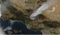 ![]() Day Fire as seen via MODIS satellite on September 19. | |