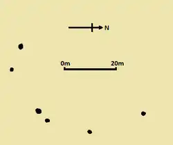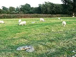 Passmore noted that in a field to the southwest of the farmhouse stood three large sarsen boulders.[28] One, which was lying on its side, measured at least 0.91 metres (3 ft) and 2.1 metres (7 ft) long. The other two were smaller.[29] Passmore related that an old man had recollected seeing other stones in this field being broken up many decades previously. The old man thought that there had once been a full circle of stones in the field, although Passmore considered this testimony "not sufficiently strong to build upon".[29] Passmore also related finding flint tools and crude pieces of pottery in the field near these sarsens.[29]