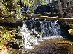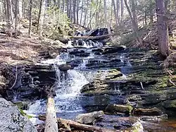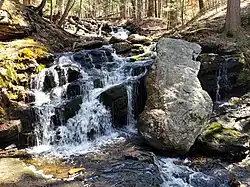 A multi-drop waterfall can be found along Day Pond Brook, dropping a total height of 40 feet (12 meters). The falls were once not well known and could not be accessed without bushwhacking. But in 2010, a spur trail was created by a Boy Scout to provide easier access to the falls for the public.[8]