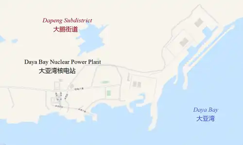 Daya Nuclear Power Plant (Chinese: 大亚湾核电站; pinyin: Dàyàwān Hédiànzhàn) is a nuclear power plant located in Daya Bay in Longgang District, along the eastern extremity of Shenzhen, Guangdong, China; and to the north east of Hong Kong. Daya Bay has two 944 MWe PWR nuclear reactors based on the Framatome ANP French 900 MWe three cooling loop design (M310), were both commissioned in 1993 and started commercial operation in 1993 and 1994 respectively.[4][1][2]