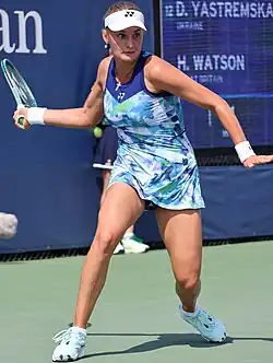 Dayana Oleksandrivna Yastremska (Ukrainian: Даяна Олександрівна Ястремська; born 15 May 2000) is a Ukrainian professional tennis player. She has been ranked as high as world No. 21 in singles by the WTA, and No. 82 in doubles, both achieved in January 2020. Yastremska has won three WTA Tour titles. Her best major performance is reaching the semifinals at the 2024 Australian Open.