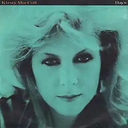 Kirsty MacColl covered "Days" on her second studio album Kite (1989). It was released as the album's second single on 19 June 1989 and peaked at No. 12 on the UK Singles Chart, the same position achieved by the Kinks in 1968. In Ireland, MacColl's version charted seven places higher than the original, at No. 9. In 1995, when the song was used in an advertising campaign for the Sony camcorder,[15] it was re-released and reached No. 42 on the UK Singles Chart. It is one of MacColl's most popular singles.[16]