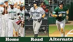 The team's color scheme consists of blue and green. Jerseys and pants for home games are made of white fabric with green trim, while those for road games are made of gray fabric with blue trim. On home jerseys, the word "Tortugas" is scripted across the chest in green. On road jerseys, the word "Daytona" is written across the chest in blue script. The player's number is written on the back in large green characters surrounded by blue.