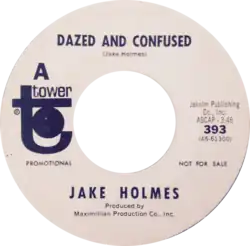 Jake Holmes began his music career in the early 1960s, and recorded and performed with several different groups.[4] He was influenced by psychedelic rock and groups such as the Byrds and the Blues Project, and wrote "Dazed and Confused" in a similar style with a blues influence.[5] In early 1967, he recorded the song for his debut solo album "The Above Ground Sound" of Jake Holmes, as a trio of acoustic guitar, electric guitar, and bass.[1] On July 10, it was released on the Tower Records label.[4]