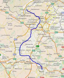 - the high gauge canal known as Canal de la Deûle which ensures the connection between the channeled Lys and the Scarpe (a tributary of the Scheldt) in Douai,[1]