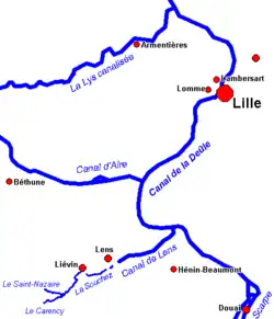 - the Canal de Lens,[2] fed by the Souchez,[3] which connects Lens with the Canal de la Deûle at Courrières.