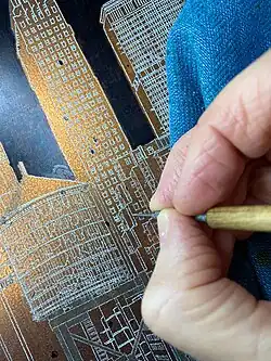 As a printmaker, Prosia utilizes only line work, in the form of cross-hatching, in her etchings to create the structure, tone, texture, and contrast of her highly detailed cityscapes. Line etching is an intalgio printmaking process where acid is used to cut into the unprotected parts of a metal place to create a design. Prosia uses a sharp sewing needle as her scribe, allowing her to build highly detailed imagery with only the use of line.[2]