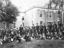 Today's DeKalb County Courthouse is the third in a line of structures to carry that name. In 1839 a log structure was built and called the county courthouse; the log building stood across the street from the current courthouse. Ten years later, in 1850, the second DeKalb County Courthouse was erected.[5] From December 13, 1902 until April 17, 1924, DeKalb-Sycamore Electric Traction Company operated a trolley route between the two cities (DeKalb and Sycamore), which ended at the DeKalb County Courthouse.[6] The current courthouse, which sits on the same site as the 1850 building, was erected in 1905.[5]