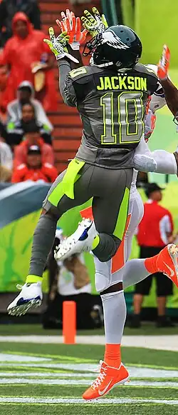 Jackson began the 2013 season with 104 yards against Washington, and followed this with a then-career-best nine receptions for 193 yards against San Diego.[72][73] After a 132-yard game 5 (for which he won offensive player-of-the-week honors), he had his first career multiple-receiving-touchdown game against Tampa Bay. In week 14 against Minnesota, he again set a new career mark of 10 receptions for a career-second-best 195 yards.[74] On the year, he led the team with 82 receptions for 1,332 yards (4th and 2nd most by an Eagle in a season).[75] Though this was statistically the best season of his career, and led to his third Pro Bowl selection, Jackson was released by the Eagles on March 28, 2014.[76][77] He left the Eagles with the franchise's 4th most receiving yards (6,117), 8th most receptions (356), 9th most receiving touchdowns (32), and tied for the 3rd most 100+ receiving-yard games (20). He was ranked 63rd by his fellow players on the NFL Top 100 Players of 2014.[78]