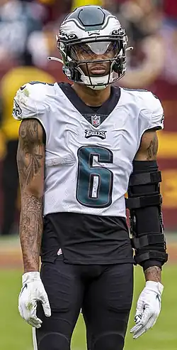 Smith was selected by the Philadelphia Eagles with the tenth overall selection in the 2021 NFL draft, reuniting him with his first college quarterback Jalen Hurts.[47] He was the third wide receiver taken in the draft after Ja'Marr Chase and Jaylen Waddle. Despite his impressive college statistics Smith fell in the draft due to concerns over his raw measurables and that his frame was considered too small to handle playing in the NFL.[48] He signed a four-year rookie contract, worth $20.1 million, on June 3, 2021.[49]