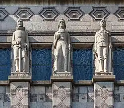 The building was the most important work of the Dutch architect Karel de Bazel and was built from 1919 to 1926 as the head office of the Nederlandsche Handel-Maatschappij (NHM).[1] The architect died in 1923, three years before completion. Construction was continued by his chef de bureau C. van de Linde, together with designer Adolf Leonard van Gendt. Sculptures on the outside of the building are by Joseph Mendes da Costa, Lambertus Zijl and Hendrik A. van den Eijnde. The stained glass windows were made by Joep Nicolas after designs by Antoon Derkinderen. The building was titled De Spekkoek, after the Dutch-Indonesian delicacy spekkoek, but is now named after the architect.