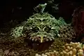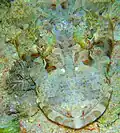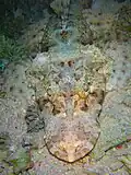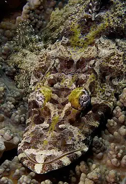 De Beaufort's flathead is a medium-sized fish which grows up to 50 cm (19.7 in), but the average size mostly observed is 35 cm (13.8 in).[2] The body is elongated and the head is particular because of its flat appearance like a duck bill. They have lappets at the rear of their globulous eyes, which help to break up the outline of the black iris and improve their camouflage. Juveniles begin black with few white spots and a white line behind the head. The adults have a body coloration which can vary in intensity according to the surrounding. The body is covered with a pattern like a mosaic of beige to brown spots or even greenish to grey separated by an interlacing of blue lines which ideally camouflages them with their habitat.[5]
