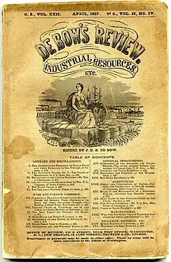 De Bow's Review was a widely-circulated magazine[1] of "agricultural, commercial, and industrial progress and resource" in the American South during the mid-19th century, from 1846 to 1884.[1] Before the Civil War, the magazine "recommended the best practices for wringing profits from slaves."[2] It bore the name of its first editor, James Dunwoody Brownson De Bow (J. D. B. De Bow, 1820–1867), who wrote much of the early issues, but there were various writers over the years (see below: Contributors). R. G. Barnwell and Edwin Q. Bell, of Charleston, appeared as editors in March 1867, after DeBow's death,[3] and W. M. Burwell was editor from March 1868 to December 1879.[1]