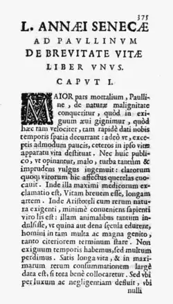 - ^ a b c Scott Smith, R. (2013). "De Brevitate Vitae". In Heil, Andreas; Damschen, Gregor (eds.). Brill's Companion to Seneca: Philosopher and Dramatist. Brill. pp. 161–166. ISBN 978-9004217089.