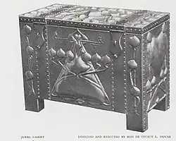 Dewar studied enamel and metalwork at Glasgow School of Art from 1891 until 1908 or 1909.[3] She was taught metalwork by Peter Wylie Davidson. Her work was often illustrated in The Studio magazine. For thirty-eight years, De Courcy taught at Glasgow School of Art, being appointed instructor of enamels by Fra Newbery. She worked alongside fellow artists Ann Macbeth, Jessie M. King, Dorothy Carleton Smyth, Jean Delville, Peter Wylie Davidson, and Kellock Brown. She instituted the Dewar Prize for enamels to be awarded at the Annual Exhibition of the Glasgow School of Art Club.[4] She had a studio at Central Chamber, 93 Hope Street, Glasgow, where she worked independently from 1900 - 1926. After 1926, she continued to work in a studio at her home at 15 Woodside Terrace, Glasgow[3]