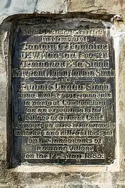 The attack seemed to be forgotten as in 1911, according to the "British North Borneo Herald", J. W. Wilson was probably the only British North Borneo resident who remembered the incident.[3] The tree where the incident occurred has been regarded as the site for the memorial and known as the "Government Tree". However, as the tree had fallen, the Resident at the time proposed erecting a small pillar on the site and fencing it in as a perpetual memorial.[3] An obelisk was built later in September 1912 on the location where Captain De Fontaine was attacked.[4]