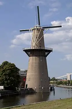 Dutch: De Nolet (also known as Noletmolen) is a wind turbine in Schiedam, Netherlands that is disguised as a traditional Schiedam windmill. De Nolet has a tower height of 43 metres (141 ft) and a gross height of 55 metres (180 ft) including its rotor tips.[1][2] The turbine's rated capacity is 150 kW.[3]