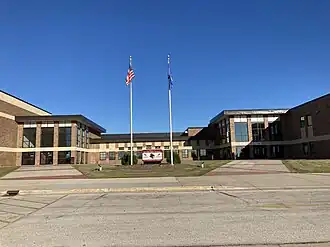 Until 1870, schooling for all grades in De Pere, Wisconsin was held in one building; starting in 1870, a high school was located in a stone building on the corner of James Street and Wisconsin Street.[3] During the back half of the 1890s, plans were made for a new high school at the corner of Chicago Street and Broadway. A fire ravaged the stone school on February 20, 1900; it was demolished in 1906 after sitting dormant.[3] After spending the rest of the term at the local German Benevolent Society Hall, the school located at Chicago and Broadway opened in fall 1900. It was quickly nicknamed the "Castle School" or "Castle on the Hill" due to its architecture and topographic situation.[4] In 1978, the current high school was built at 1700 Chicago Street. It underwent major expansion in 2001, with the addition of a gymnasium and several classrooms. In January 2007, more classrooms were added. In 2017, De Pere High School underwent another small expansion. De Pere High School's mascot is the Redbird.