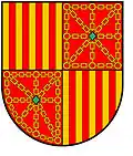 The second, of the Portugal-Noronhas , in the I and IV quarters, shows five blue shields cross-shaped, each with five silver bezants, placed to quincunx of the house De Portugal and, in the II and III quarters, the castle with the three golden towers surmounted by two crimson lions of the house of Castiglia and of Leon. The quarter is framed by nine golden squares alternated by nine blue towers. doña Isabel de Portugal, bastard daughter of king Ferdinand I, married don Alfonso count of Gíjon Noronha, bastard son of the king Enrico II di Castiglia. Heraldry joins the symbols by matrilineal descent: Portugal-antigo (only because of the matrilineal line of the descendants of doña Isabel, daughter recognized by the king Ferdinando I) with that of the Noronhas.[16]