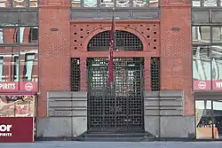 The seventh bay from the west is flanked by quoins, visually separating the original building to the west and the annex to the east. Within this bay, the first story contains an entrance; the second and third stories have a double-height round arch; and the fourth story has a segmental arch. The upper stories of the seventh bay are recessed and consist of two double-height, round-arched window openings.[32] The four-bay-wide annex to the east is decorated with a wrought-iron fire escape.[28] In contrast to the rest of the building, the annex is topped by a terracotta cornice.[32]
