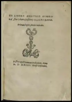 De libero arbitrio diatribe sive collatio (literally Of free will: Discourses or Comparisons) is the Latin title of a polemical work written by Desiderius Erasmus of Rotterdam in 1524.[1] It is commonly called The Freedom of the Will or On Free Will in English. It was written to call out Martin Luther's revival of John Wycliffe's teaching that "everything happens by absolute necessity".