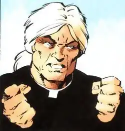 Deacon Blackfire is a con man and cult leader who claims to be over a century old.[2] He and his followers lead a violent war on crime, overtaking Gotham City and isolating it from the rest of the United States. Blackfire captures and brainwashes Batman, but he escapes his control and turns Blackfire's army against him, killing him.[3]