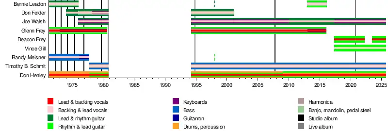 ![]() The Eagles in 2008 during their Long Road Out of Eden Tour. Left to right: Glenn Frey, Don Henley, Joe Walsh, Timothy B. Schmit, and (behind them) touring drummer Scott F. Crago | |