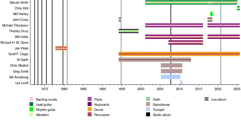 In 2025, touring lead guitarist Steuart Smith was replaced by Chris Holt. Smith retired due to Parkinson's disease.[112]