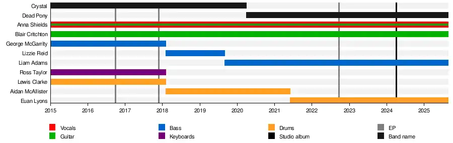 Dead Pony, formerly known as Crystal, is a band from Glasgow, Scotland formed in 2015. Initially a duo comprising Anna Shields and Blair Crichton, the pair formed Crystal with three of their university classmates. Two years later, Shields and Crichton formed a new quartet with Lizzie Reid and Aidan McAllister and released numerous singles as Crystal, before Liam Adams replaced Reid. The band changed their name to Dead Pony in 2020.