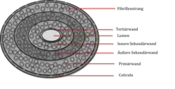 Microscopic views of dead fibers exhibit extremely thin cell walls; the fibers appear as flattened and slightly twisted tapes, with collapsed lumen.[9]