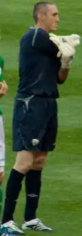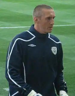 Kiely played for England at under-15 (13 caps), under-16 (13 caps) and under-18 (four caps in 1988) levels.[2][27] He made one appearance for Republic of Ireland B, starting in a 4–3 win over League of Ireland XI on 9 February 1999, in which he was substituted for Nick Colgan.[1][28] He went on to represent the Republic of Ireland at full international level, earning his first cap as a substitute in a UEFA Euro 2000 qualifying play-off against Turkey in November 1999.[29] He retired from international football in February 2003,[30] but in April 2008 Ireland's assistant manager Liam Brady suggested that Kiely could make a return to the squad.[31] The rumours were then confirmed when he returned to the Ireland squad in Giovanni Trapattoni's first squad as manager in May 2008.[32] He won his first cap in five years when he appeared in the Republic's 1–1 draw with Serbia that month, playing the full 90 minutes.[33] On 28 May 2009, he walked out of the Ireland squad after Trapattoni informed him that he would be replacing Shay Given with Keiren Westwood for the second half of the friendly International against Nigeria at Craven Cottage on 29 May.[34] He was capped 11 times by the Republic of Ireland, last appearing in 2008.[35]