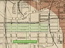 In the aftermath of the 1874 fire, much of the land that is now Dearborn Park was purchased by real estate promoter John B. Brown and his associates, who saw the potential of southside access to the city by rail and acquired the land, principally for the Chicago and Western Indiana Railroad (C&WI) but other rail lines also bought nearby land.[11] (Perhaps not surprising to those who live in Chicago, there were accusations of bribery[12] and self-dealing[13] regarding the acquisition of the land.) The investment in the rail lines culminated in the opening of Dearborn Station at the northern border of Dearborn Park in 1885,[14] resulting in decades of economic growth in the area that reversed course into steep decline in the 1950s and 1960s.[15] Dearborn Station ultimately closed in 1971.[14]
