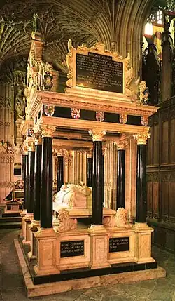 Another hearse in the Abbey was decorated with the motto "Dieu Et Mon Droit". The painter Nicholas Lizard made a dome for the hearse with pictures of the four evangelists.[38] Mary was buried on the north side of Henry VII's chapel on 14 December after a Requiem Mass. The funeral sermon was given by John White, Bishop of Winchester.[39][40] Her officers broke their staffs or wands of office and threw them in the grave.[41]
