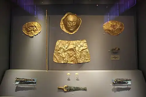 The death masks of Mycenae are a series of golden funerary masks found on buried bodies within a burial site titled Grave Circle A, located within the ancient Greek city of Mycenae. There are seven discovered masks in total, found with the burials of six adult males and one male child. There were no women who had masks.[1] They were discovered by Heinrich Schliemann during his 1876 excavation of Mycenae.