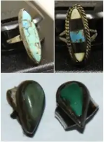Perry County Jane Doe wore several pieces of jewelry. She was wearing two sterling silver rings with turquoise stones, one of which also contained onyx pieces that are believed to have originated in the Southwest, possibly having been made by Navajo or Zuni Native Americans inhabiting that area.[11] She also had a chain bracelet on her right arm and a turquoise necklace and earrings.[2][6] The jewelry led authorities to believe the victim had ties to Arizona, New Mexico or a similar region.[1]