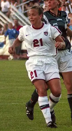 Keller played for the United States women's national soccer team from 1995 to 1999. In 1998, her 14 goals ranked third on the team behind Mia Hamm and Tiffeny Milbrett.[8] She was cut from the team before the 1999 FIFA Women's World Cup and unsuccessfully took legal action to be reinstated, suggesting her exclusion by coach Tony DiCicco had been a retaliation for the Dorrance lawsuit.[9]