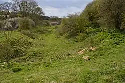 The flood plain of the stream has tall fen vegetation, mainly common reed, while in some areas plants such as tussock sedge and lesser pond-sedge are locally dominant. Other habitats are neutral grassland, broad-leaved woodland and species-rich calcareous grassland. Locally rare plants are yellow figwort and woolly thistle. The site has a badger sett.[1]