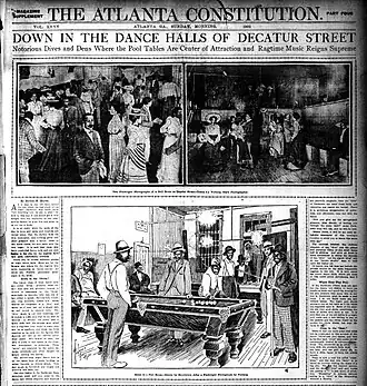 In the early 20th century, Decatur Street was an African American entertainment district. In 1906 it was the a focal point of the Atlanta Race Riot; allegations that the street's dive bars, frequented by blacks, were showing nude pictures of white women and "troublesome Negro vagrants" were hanging around there were among the allegations whipping up anti-black sentiment among poor whites. After the riot, the Atlanta Constitution regularly ran stories documenting city efforts to clean up the street's dance halls, saloons, and dives; ragtime music; whiskey and drug peddling.