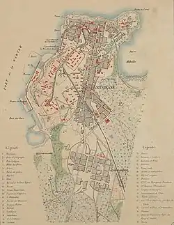 The 600 mm (1 ft 11+5⁄8 in) gauge Decauville railway was built in 1900 from Antsirane (now Antsiranana) to the Tunisian Fountain (Fontaine Tunisienne) at today's STAR factory.[1] It started at the port and ran on the Rue Gouraud and the Boulevard Bazeilles up to the Cercle Français (now Suarez Art) and up the Boulevard Militaire. It turned into the Boulevard de Sakaramy at the height of Camp Lubert, from where it led past the present town hall to l'Octroi and the Tunisian Fountain. At the end of 1900, it was extended from the Tunisian Fountain via Antanamitara and Andranomanitra to the junction of today's road to Joffreville.[2][1]