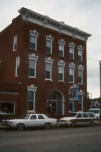 The Decker House Hotel is a historic building located in Maquoketa, Iowa, United States. James Decker, an entrepreneur from Watertown, New York held numerous real estate holdings in and around Maquoketa. He built the first Decker House, a frame structure, in 1856. After Maquoketa was named the county seat in 1873, Decker decided to replace it. The three-story, brick, Italianate building was designed by Watertown architect W.W. Tucker. Its decoration is limited to the north and east elevations. Noteworthy, is its metal cornice and window hoods. It opened in May 1878, and it had two other competitors in town at that time.[2] Following his death in 1881, James Decker's son Leonard took over his holdings in New York and Iowa. He moved into the Decker House in 1885 and died there in 1900. The building has subsequently lost its entrance porch, original front doors and the pediment over the cornice. It was listed on the National Register of Historic Places in 1978.[1]